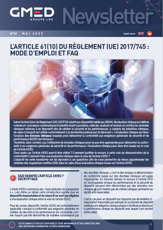 L’objectif de cette newsletter est de répondre à ces questions afin de vous permettre de mieux appréhender les attentes des organismes notifiés (ON) dans le cadre d’une évaluation clinique basée sur l’article 61(10).